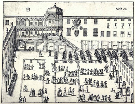 Il Broletto e la Piazza in un disegno a penna del 1687, allegato agli atti di un processo per un fatto di sangue avvenuto sulla piazza la Vigilia di Natale del 1687 (Pavia Musei Civici). Si evidenzia la Cappella con la cupola e l'altare con i candelieri e la croce